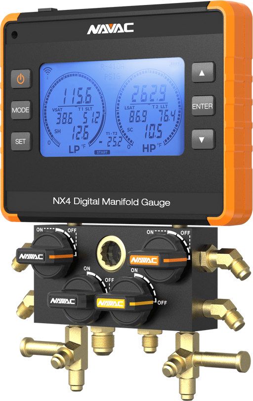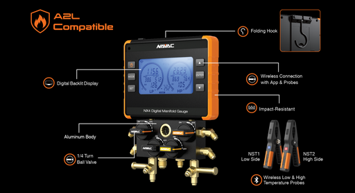 El manómetro digital NAVAC NX4 Nexus revoluciona el diagnóstico de HVAC con funciones inalámbricas avanzadas. Equipado con 4 válvulas, incluyendo u...